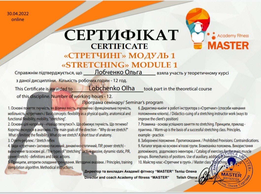- сертифікований інструктор за напрямками : інструктор групових програм, інструктор тренажерного залу.