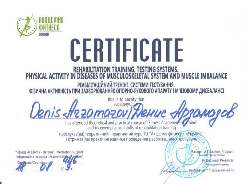 Хобі та захоплення: постійне вдосконалення своїх знань в області фітнесу, дієтології та реабілітації.Цікавлюся сучасними методами тренувань і стежу за трендами у спорті.