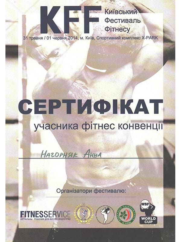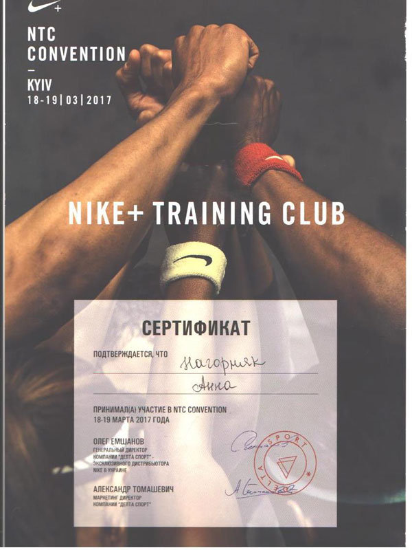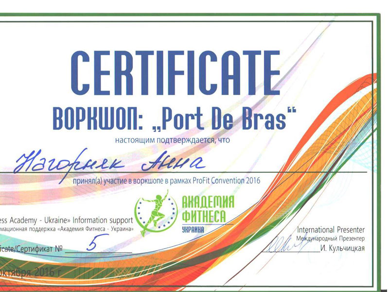 Досягнення: - презентер всеукраїнських фітнес-конвенцій; - сертифікований інструктор напрямків Pilates, Step, Aerobic, Barre, TRX, Stretching, MFR, Functional training та ін.;