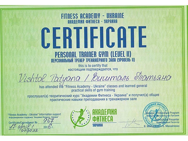 - сертифікований тренер з фітнесу та бодібілдингу;