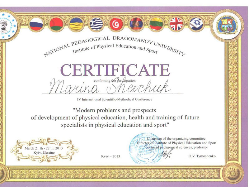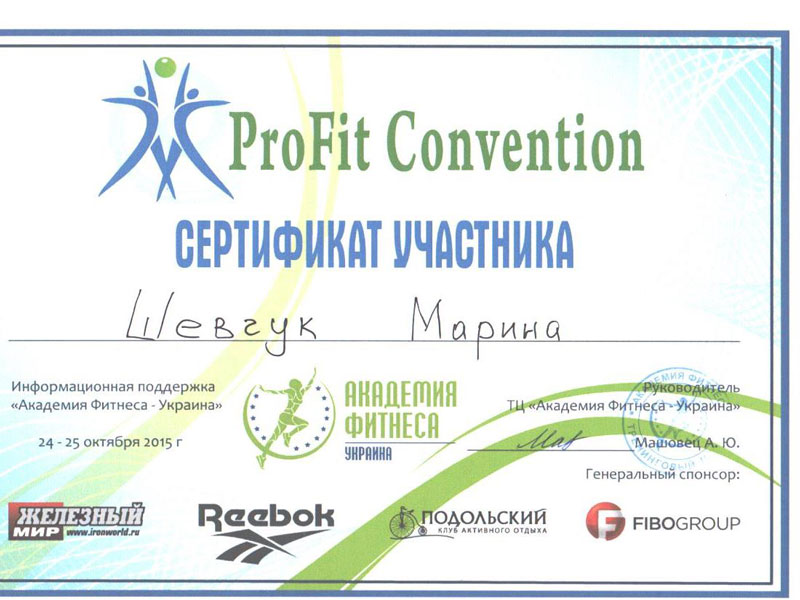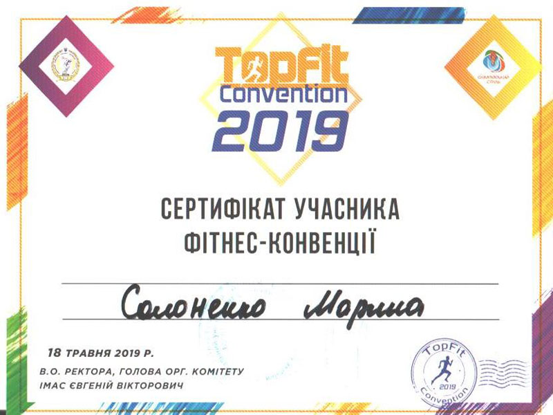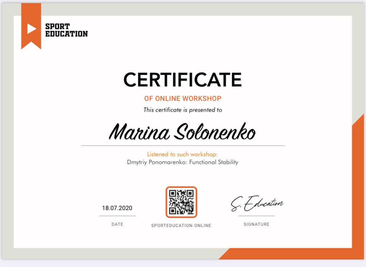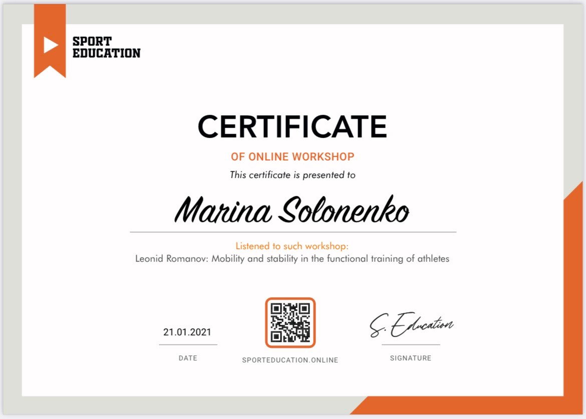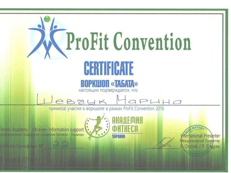 Сертифицированный специалист по направлению групповой тренировки Tabata. Член Европейской Ассоциации Ereps.