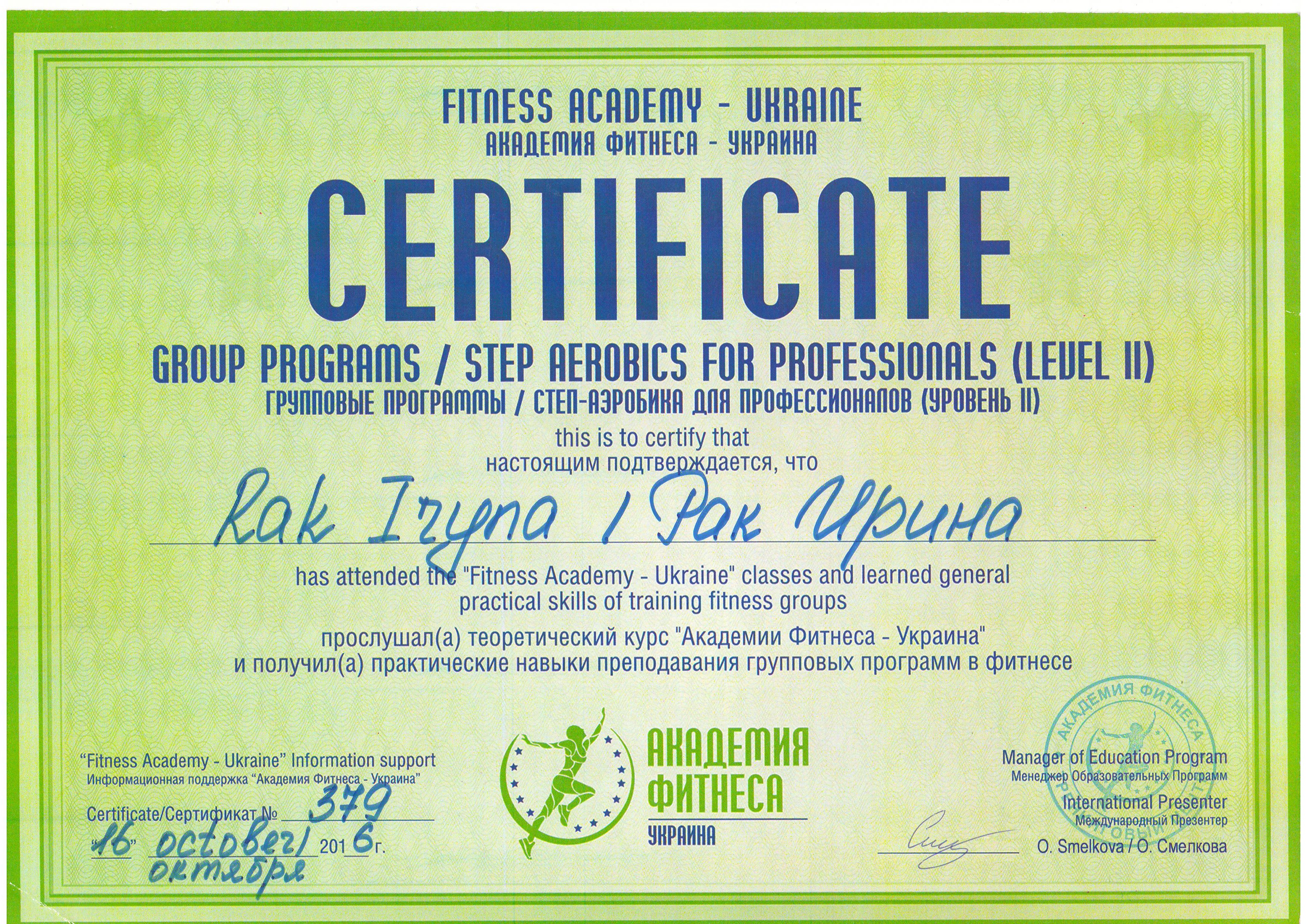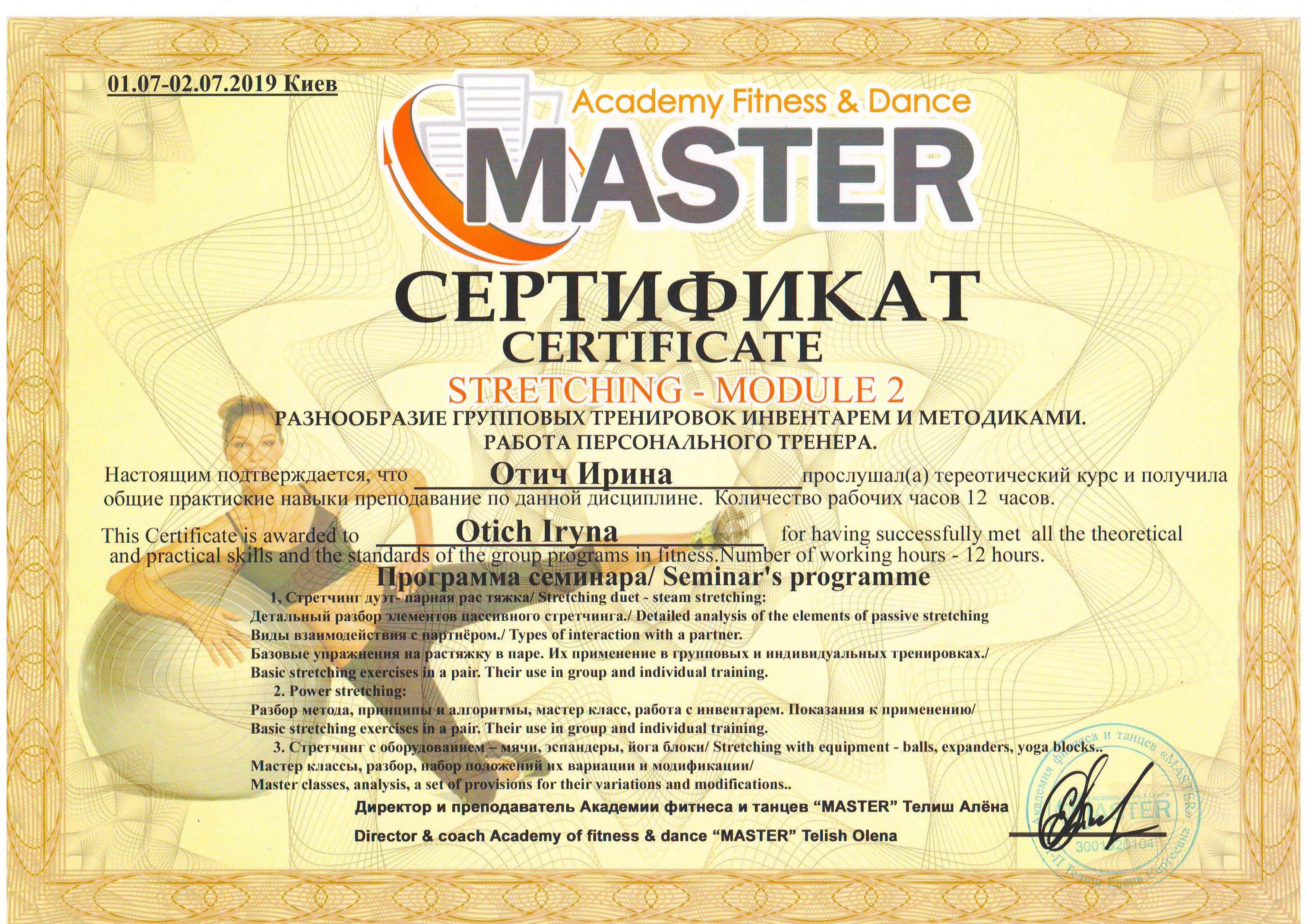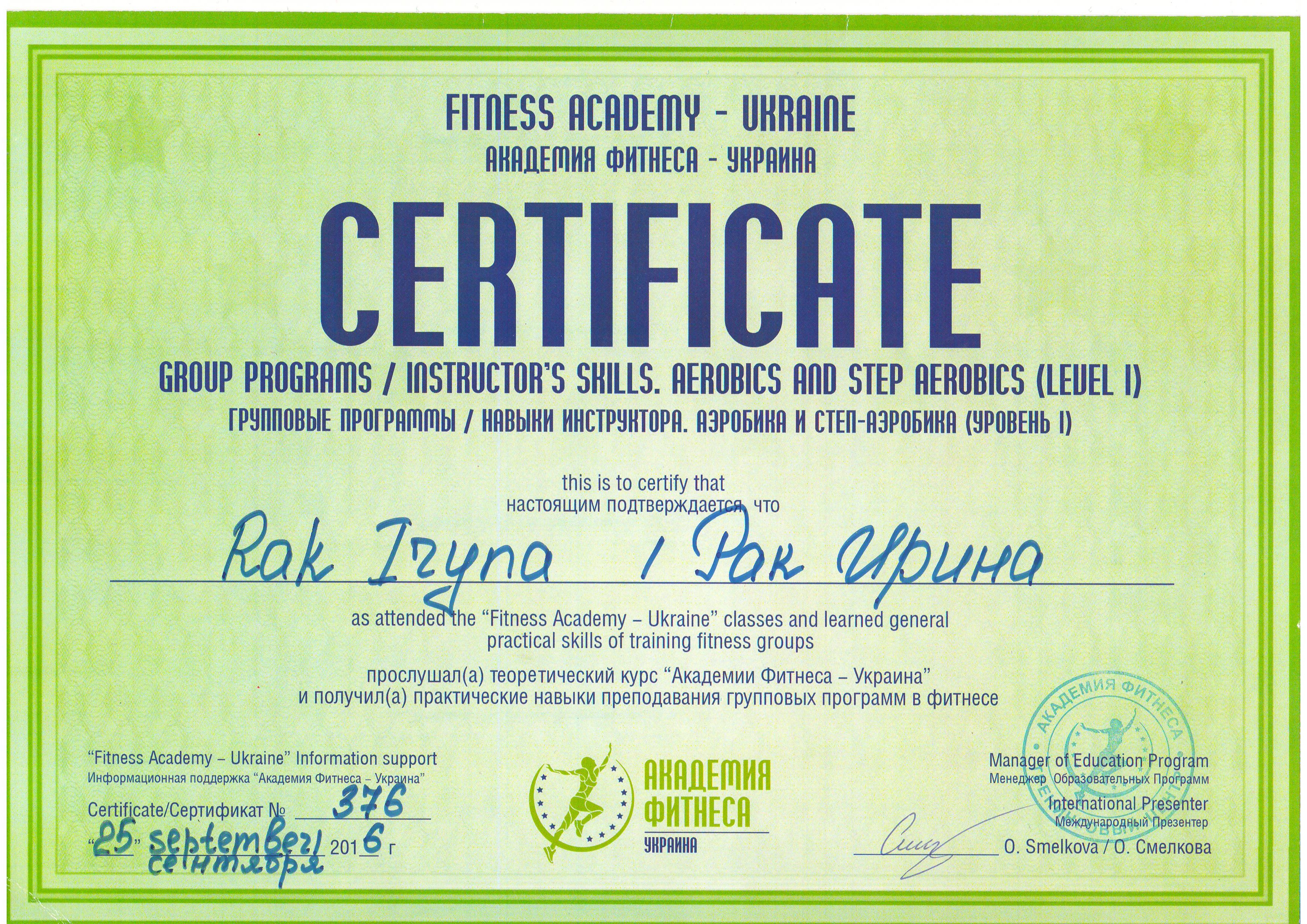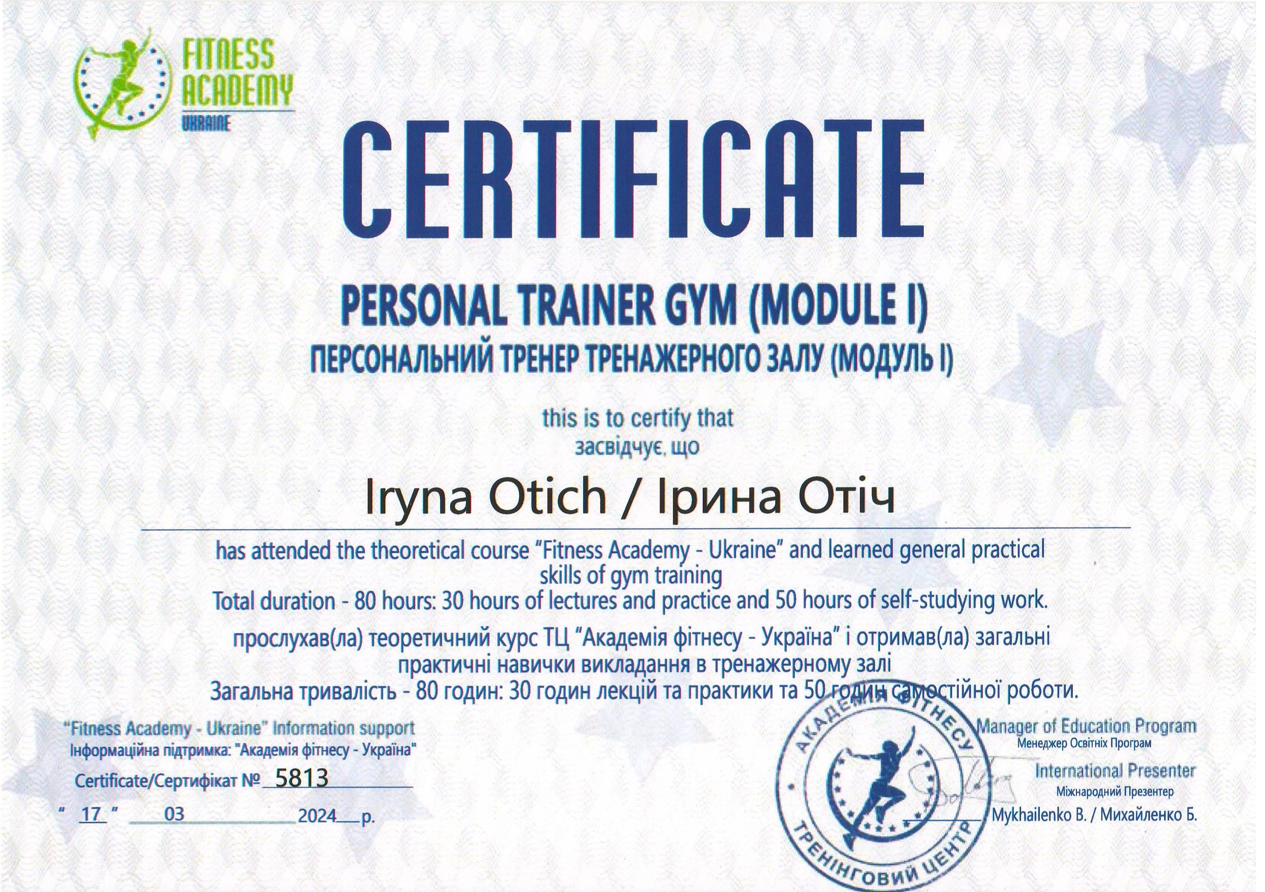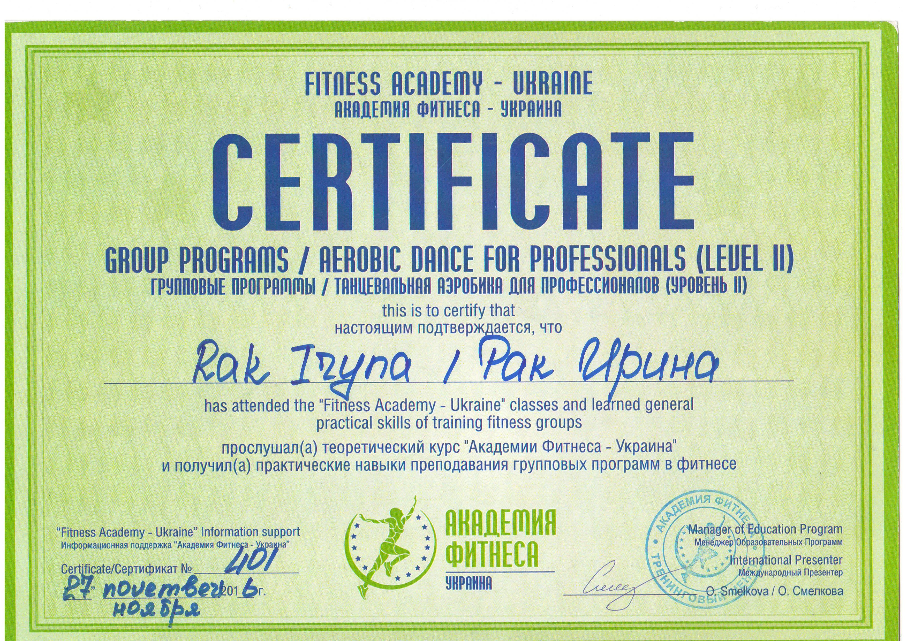 Должность: персональный тренер тренажерного зала, тренер групповых тренировок "FIZRA" и "PILATES".