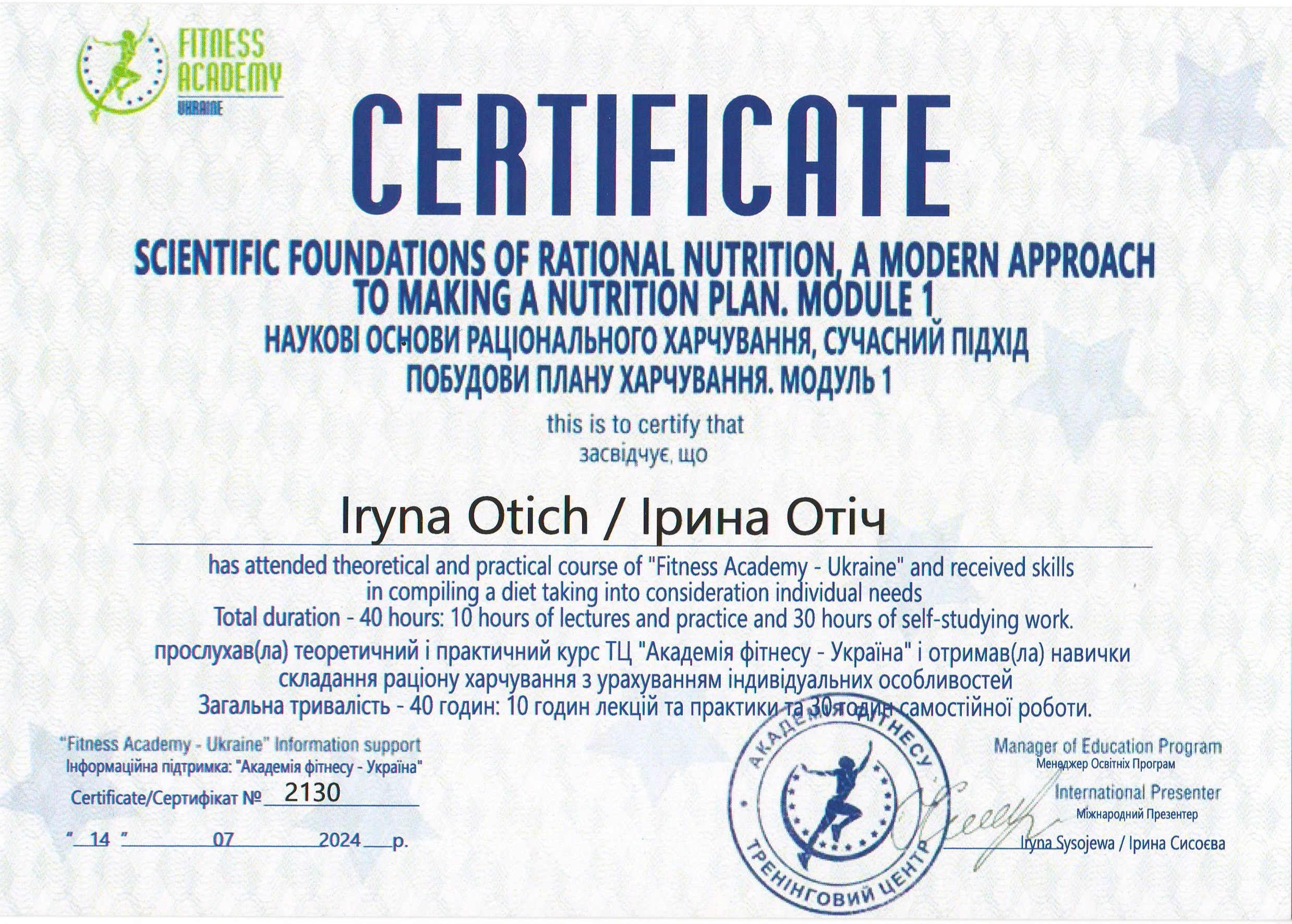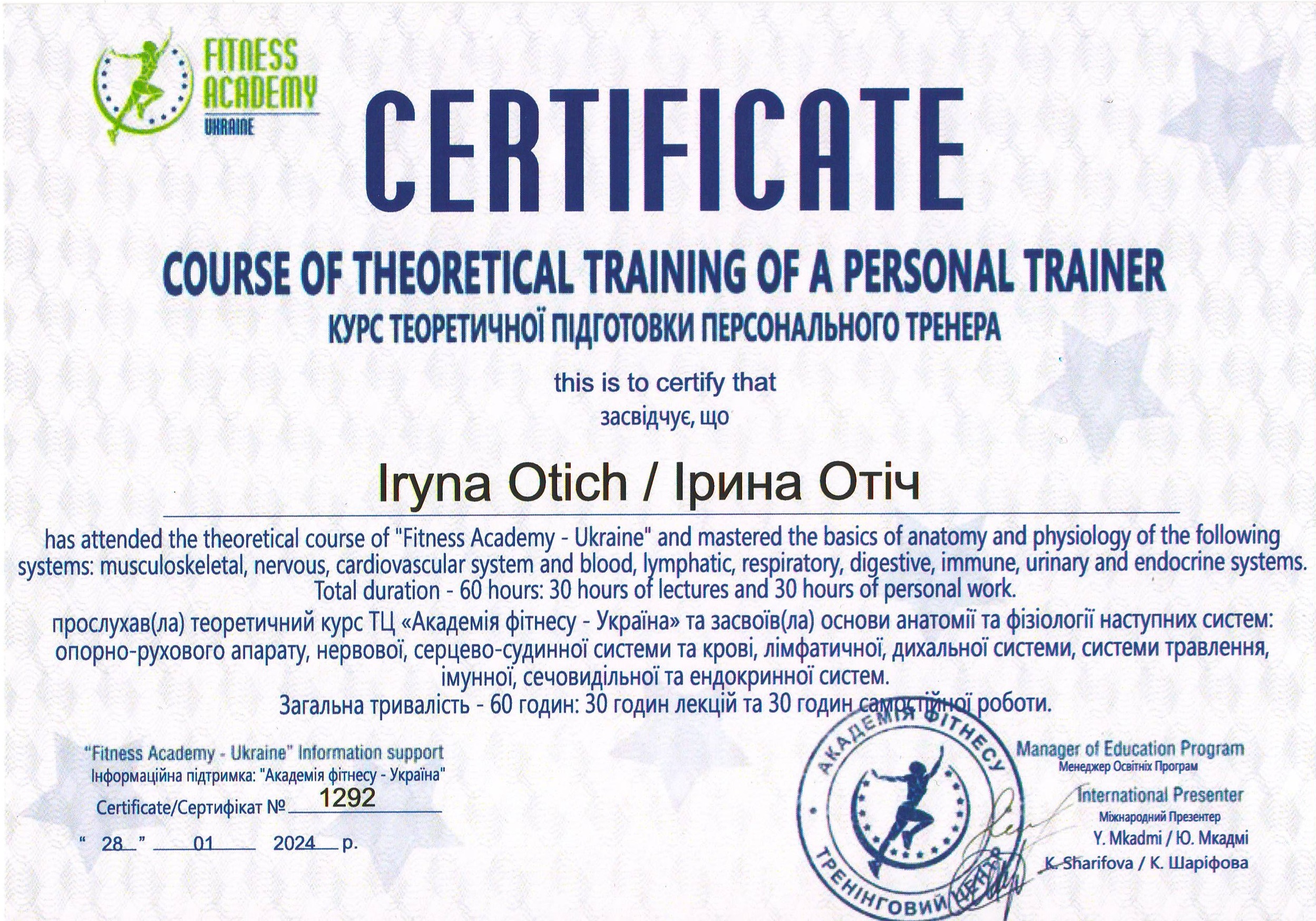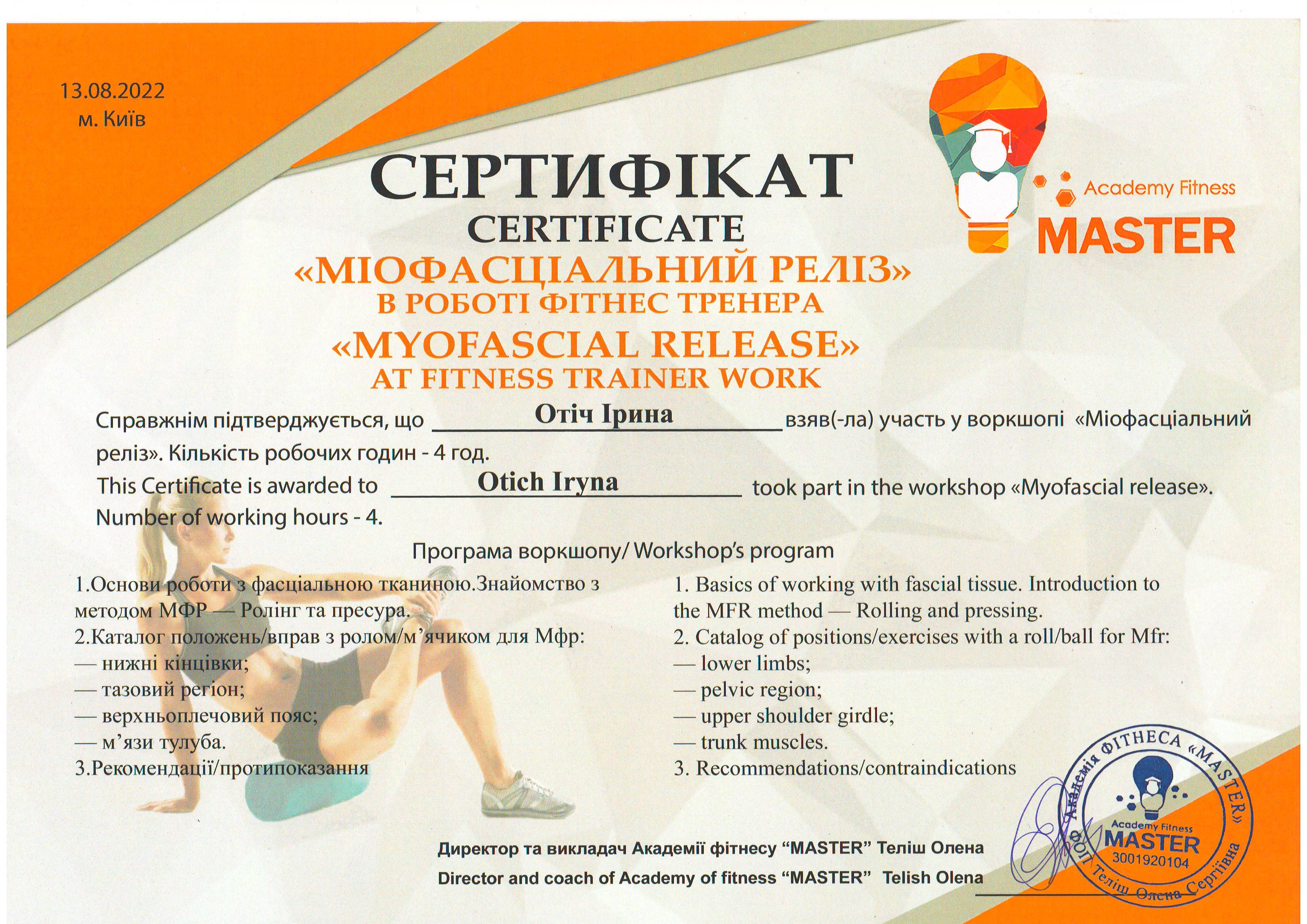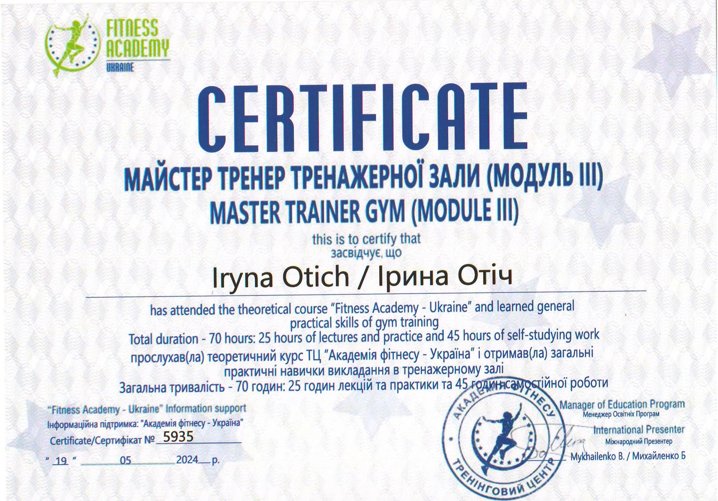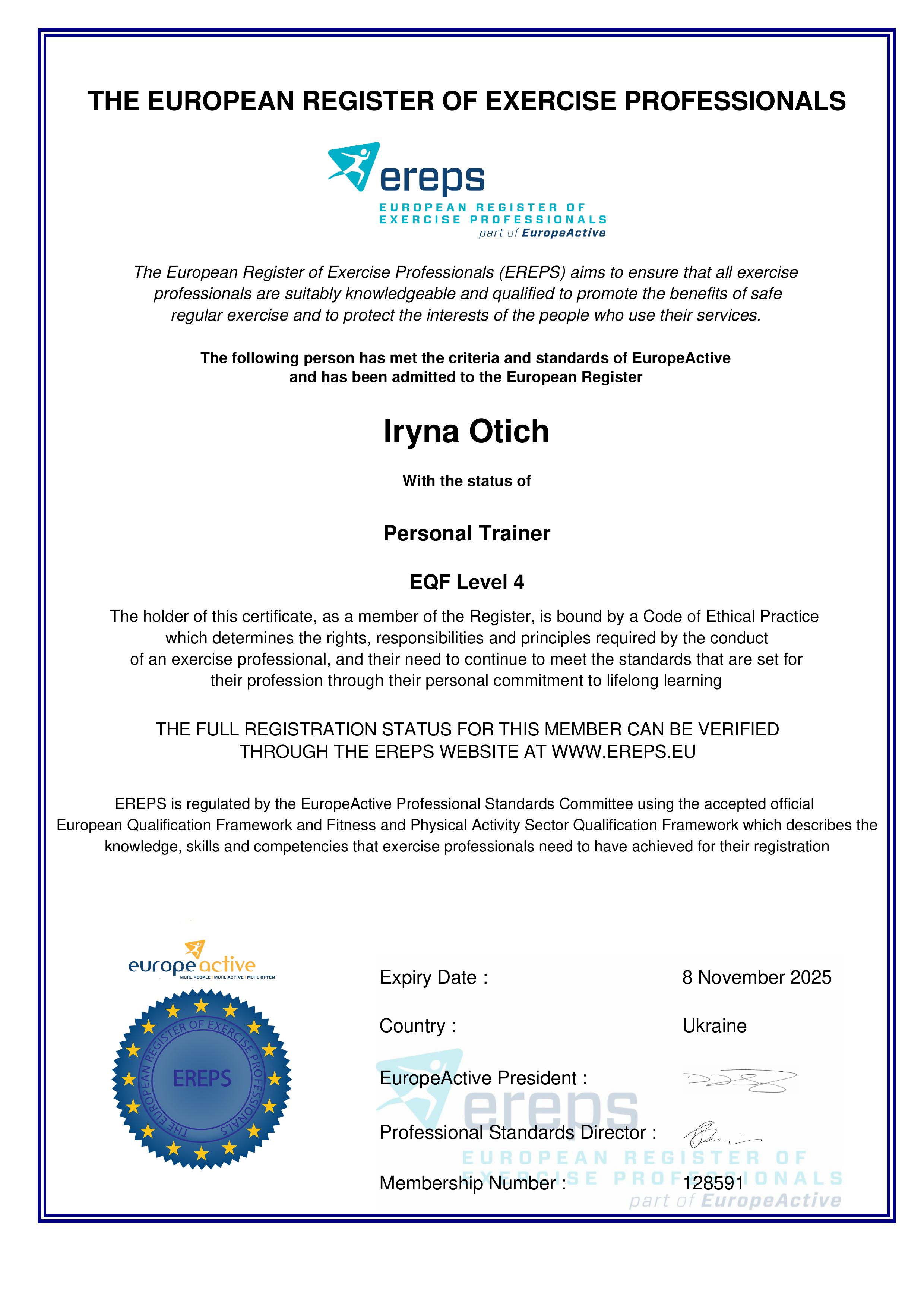 Должность: персональный тренер тренажерного зала, тренер групповых тренировок "FIZRA" и "PILATES".
